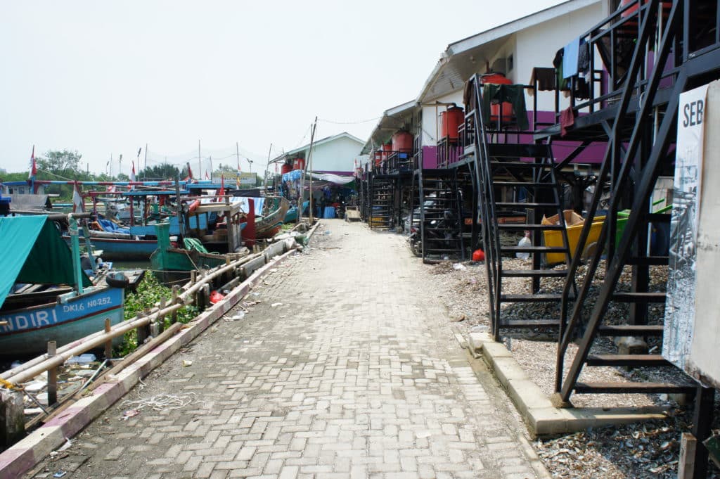 De retour à Muara Angke, nous longeons le quai où sont ancrés les bateaux de pêche traditionnels en bois. Au loin, de hautes tours d’habitation entourées d’un imposant centre commercial se dressent devant la mer, défiant toutes prédictions quant au niveau des eaux.